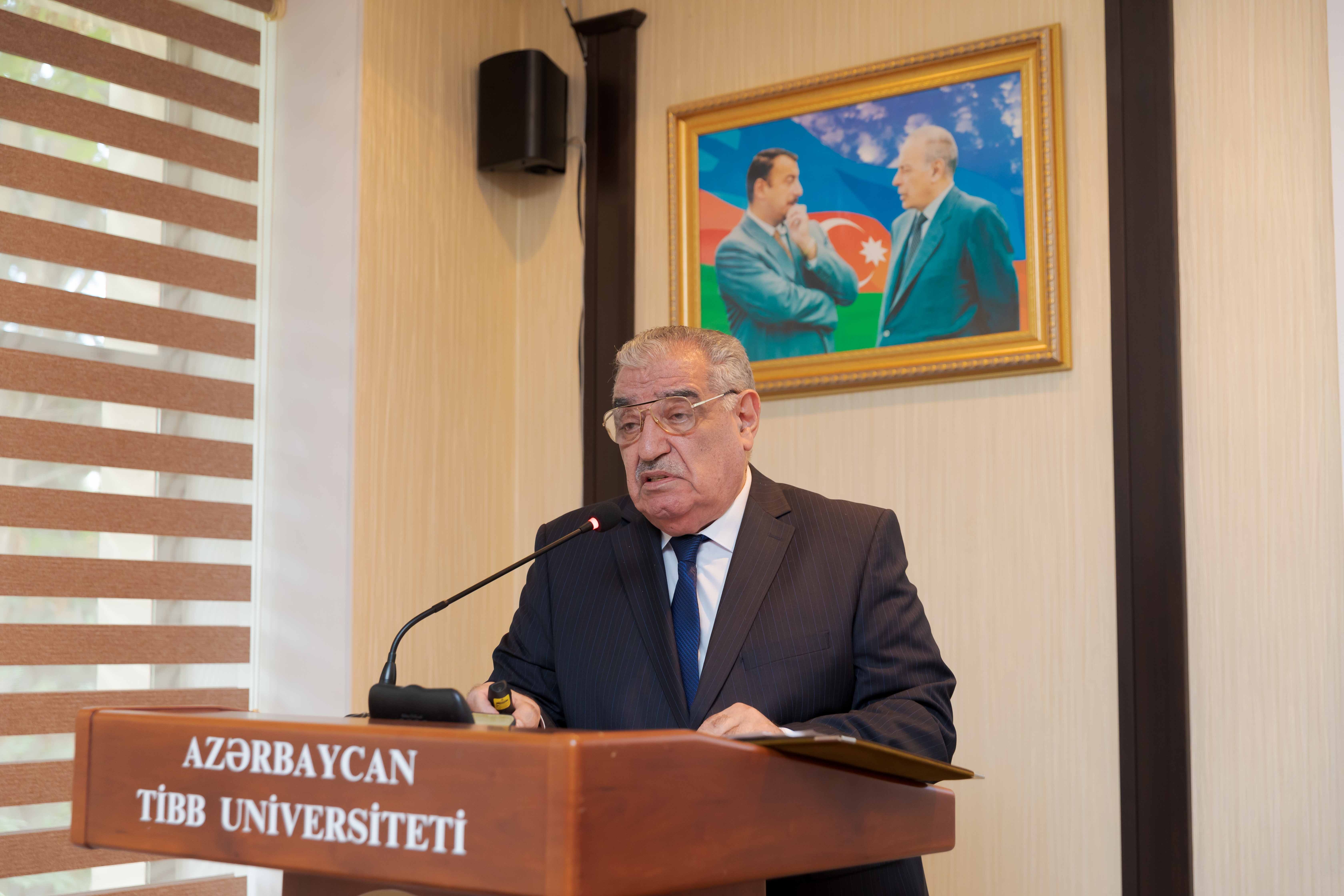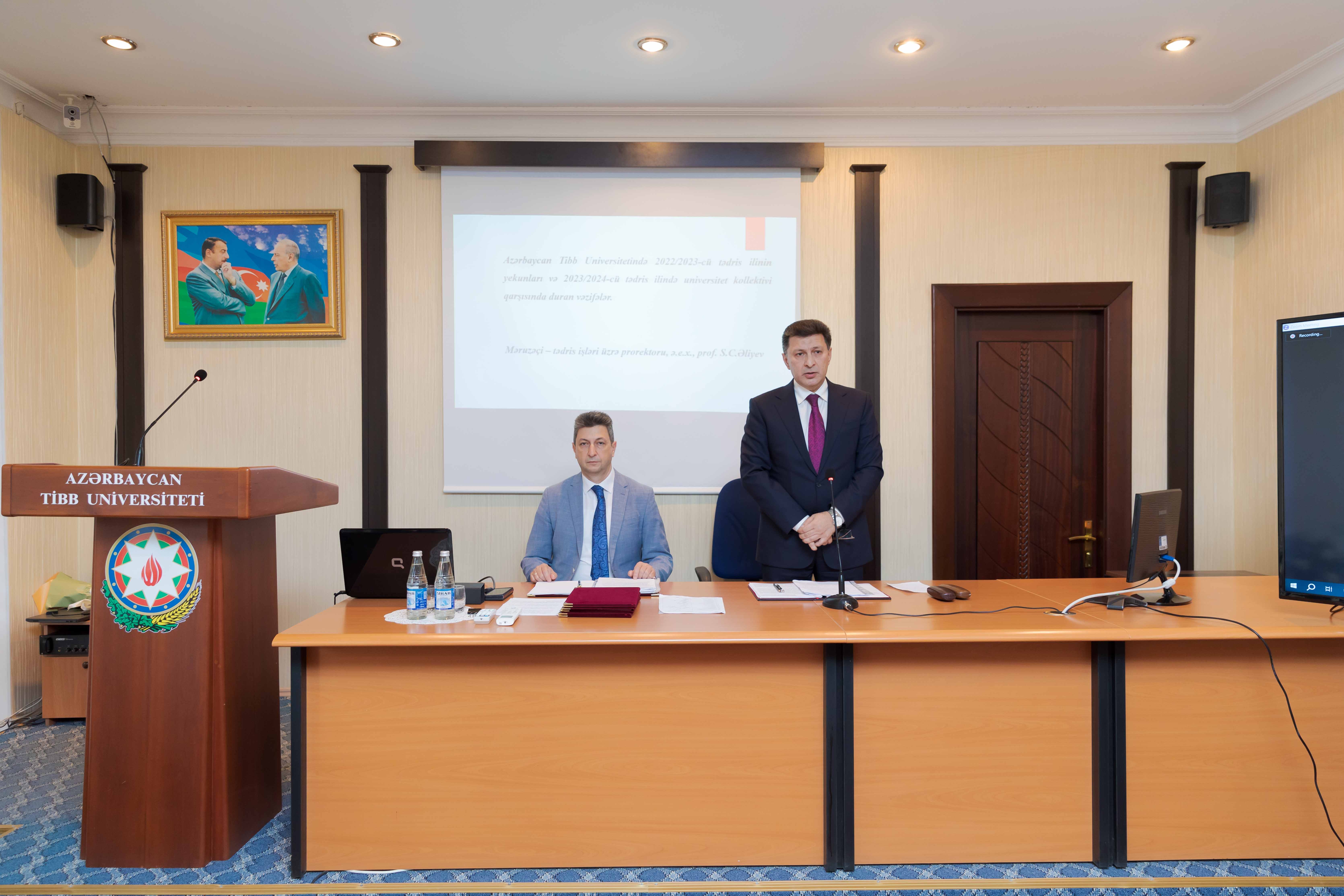 Gündəlikdə duran məsələlərin müzakirəsindən öncə II Qarabağ müharibəsindən 3 il ötdüyünü xatırladan rektor, müzəffər Ali Baş Komandan cənab İlham Əliyevin rəhbərliyi altında rəşadətli ordumuzun şanlı qələbəsindən danışıb. O, 44 günlük Vətən müharibəsində 30 il işğal altında qalan torpaqlarımızın azad edildiyini, bu il sentyabrın 20-də isə 24 saatdan da az müddətdə həyata keçirilən lokal antiterror tədbirləri nəticəsində Azərbaycanın öz suverenliyini tam bərpa etdiyini diqqətə çatdırıb. Torpaqlarımızın işğaldan azad edilməsi uğrunda gedən döyüşlərdə və antiterror əməliyyatı zamanı həyatlarını itirən şəhidlərimizin xatirəsi bir dəqiqəlik sükutla yad olunub.