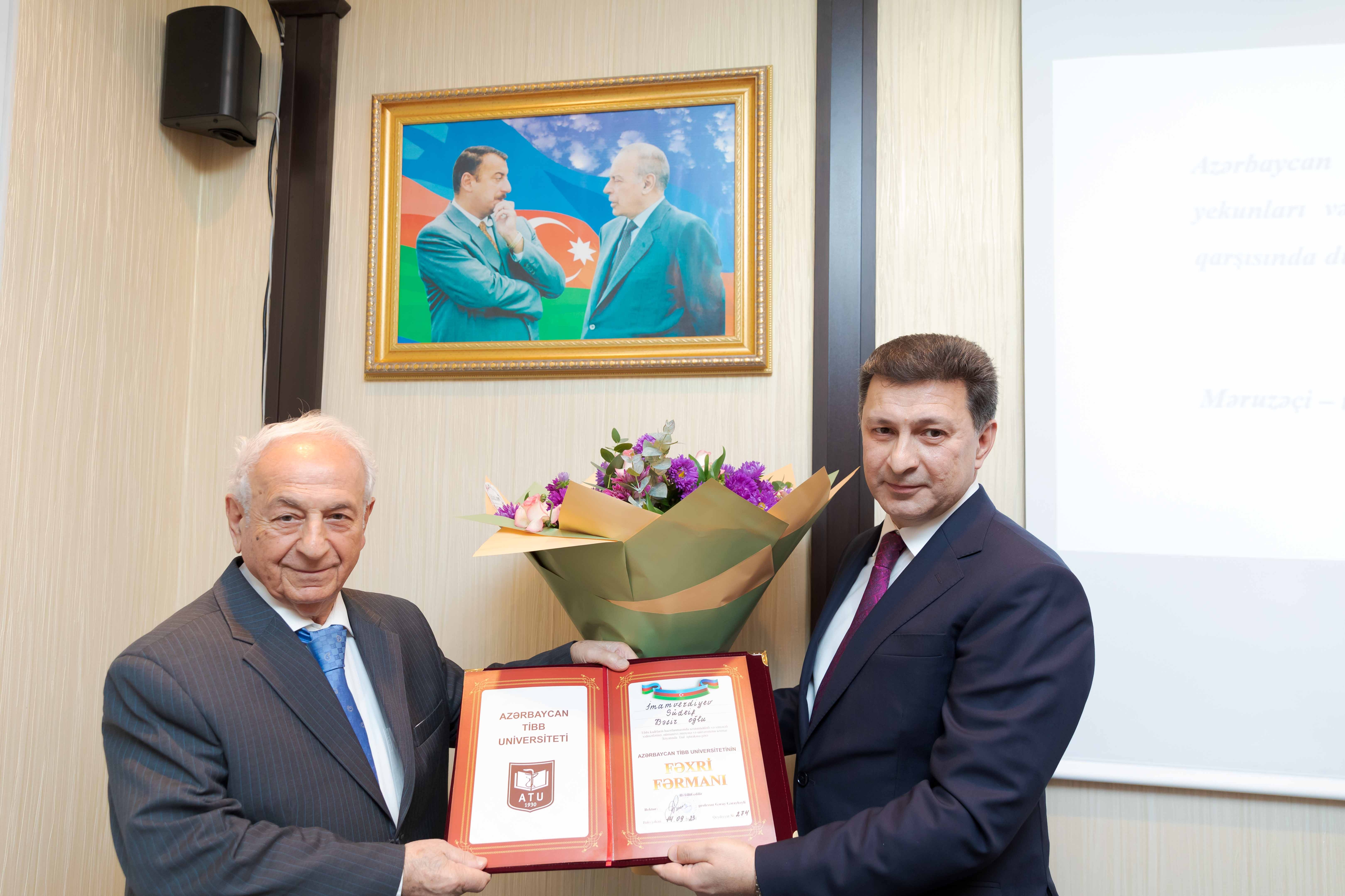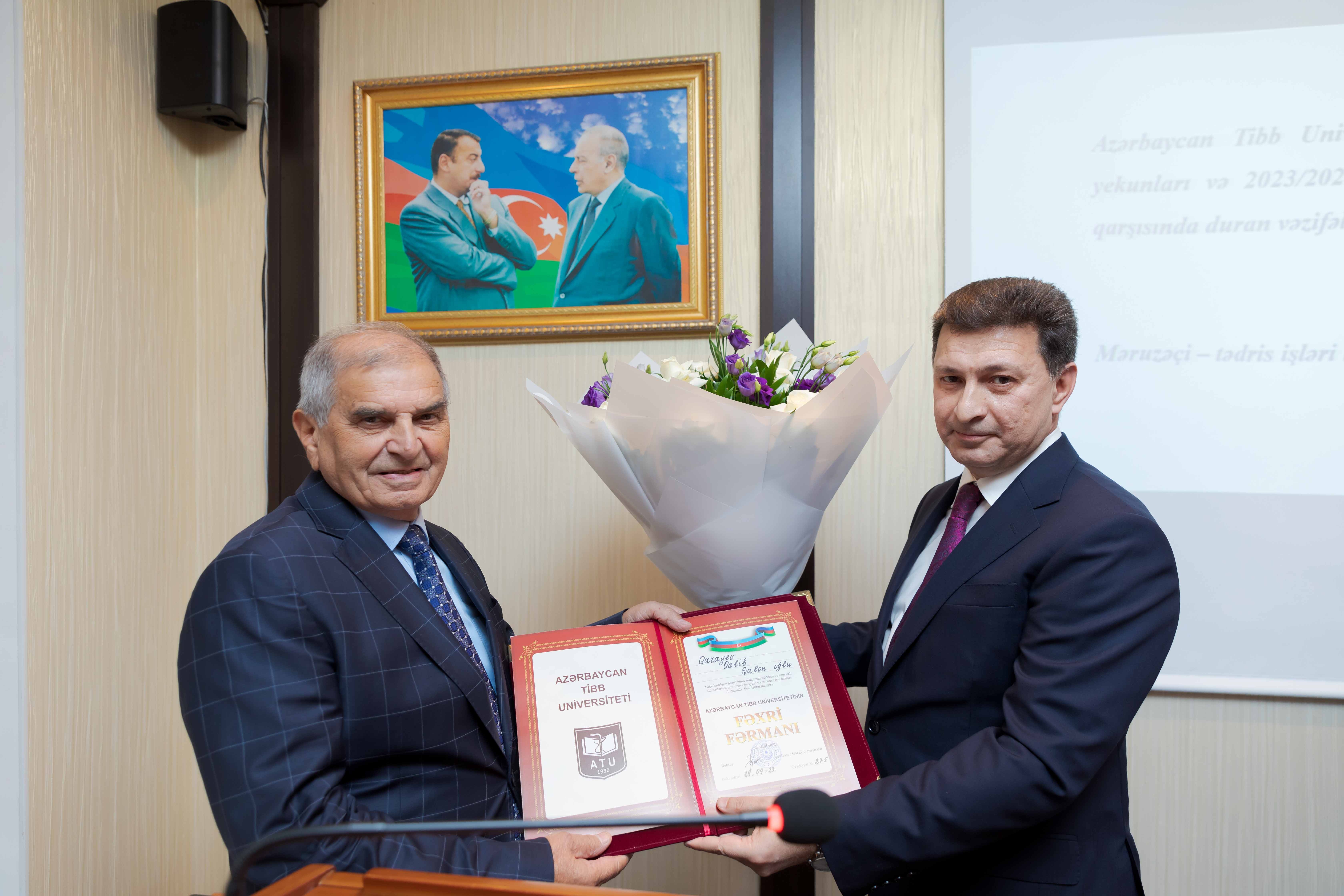 Bundan sonra AMEA-nın müxbir üzvü, professor Sudeyf İmamverdiyevi 85, AMEA-nın müxbir üzvü, professor Nuru Bayramovu isə 60 illik yubileyi münasibətilə təbrik edən rektor, 42 il ATU-nun Elmi Tədqiqat Mərkəzinə uğurla rəhbərlik edən və bu günlərdə öz ərizəsi ilə vəzifədən gedərək estafeti gənc kadrlara ötürən professor Qalib Qarayevin xidmətlərini də yüksək qiymətləndirib.