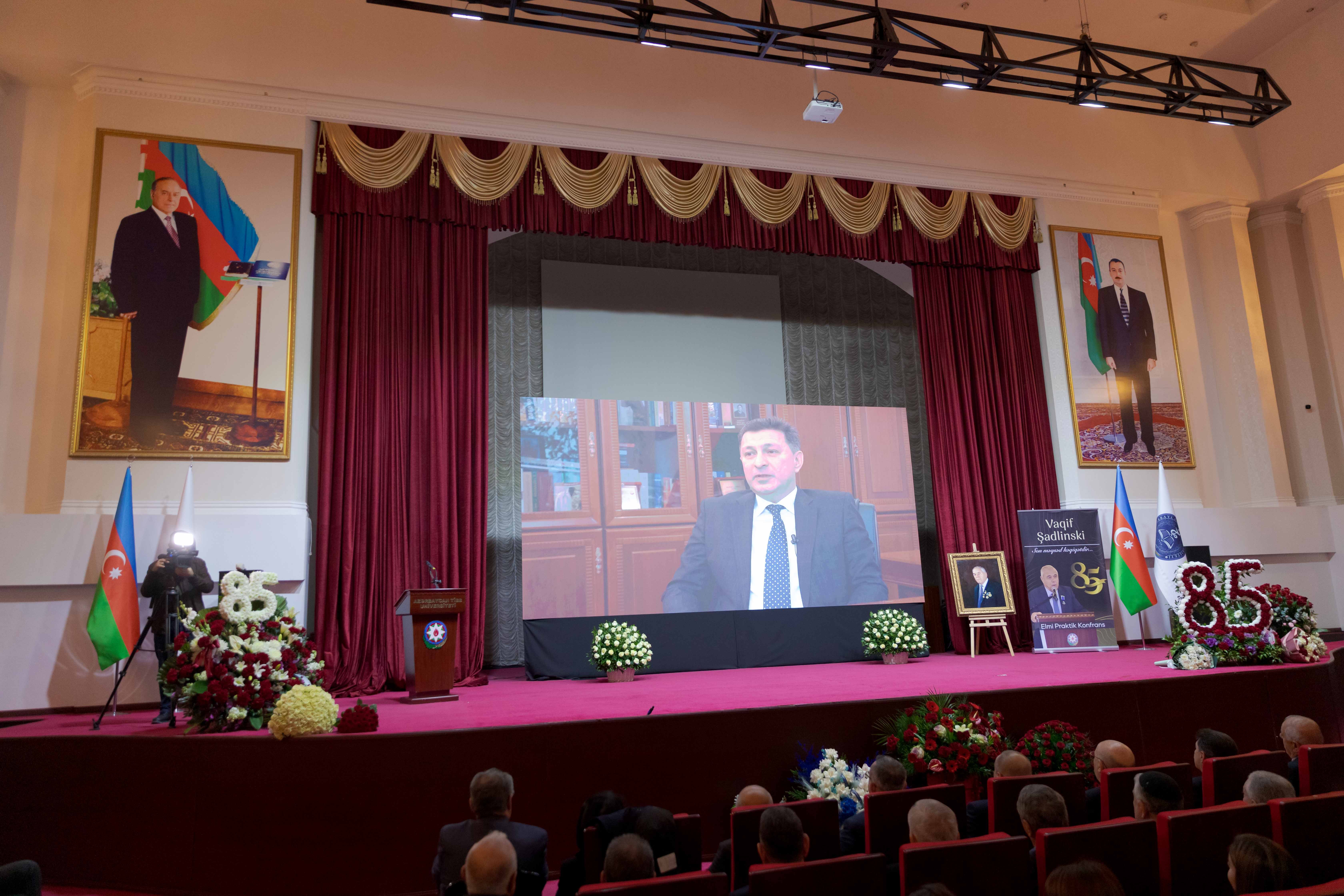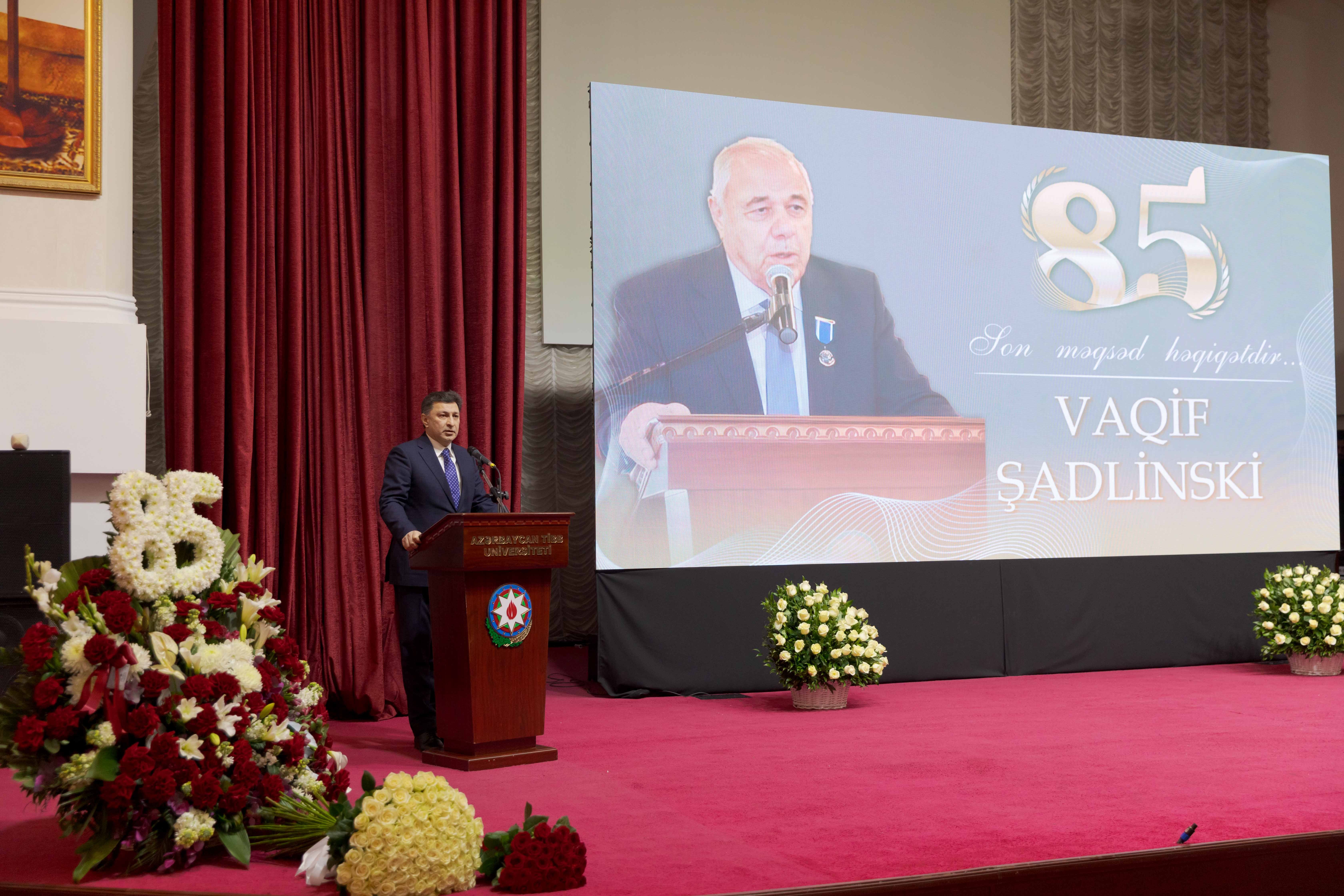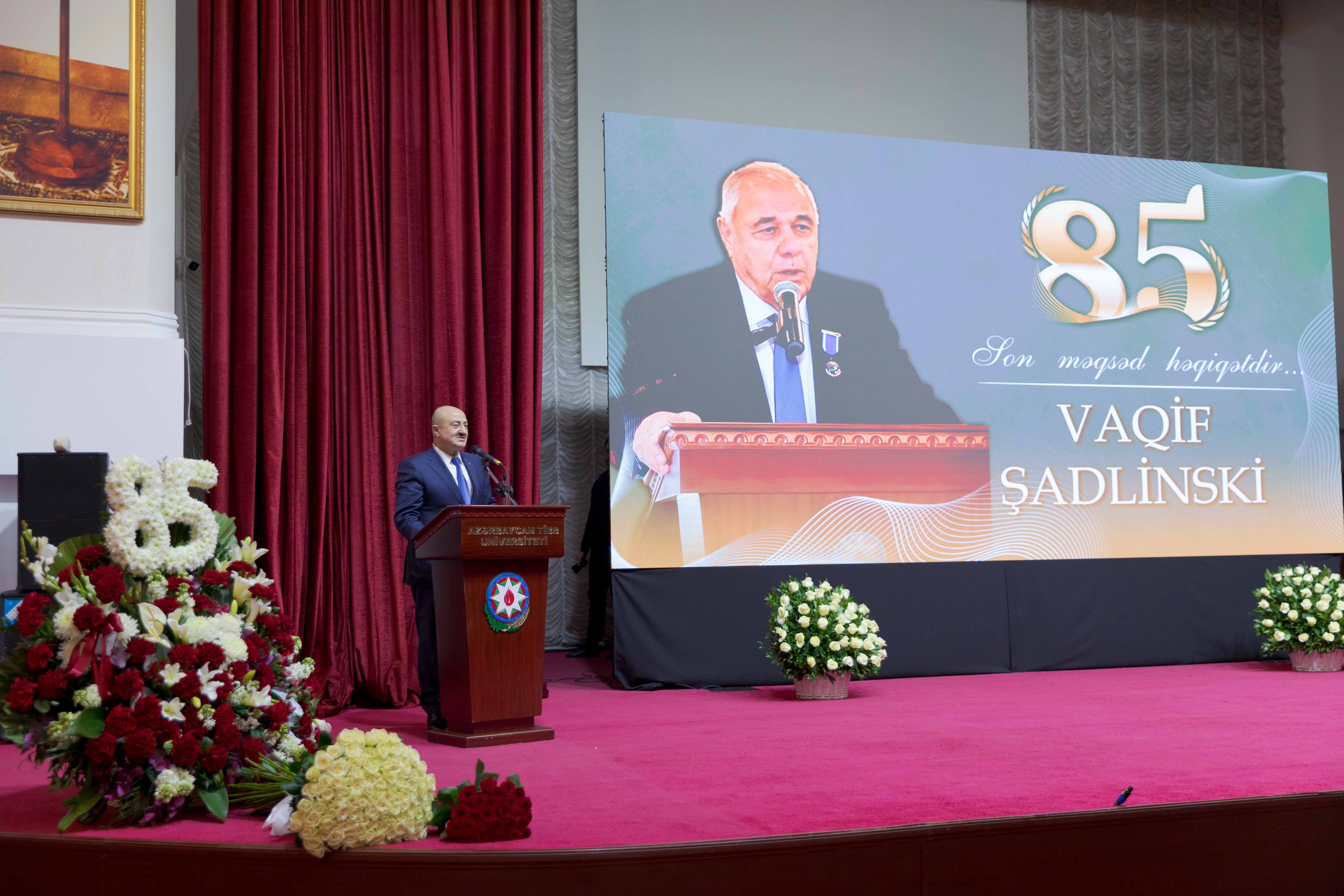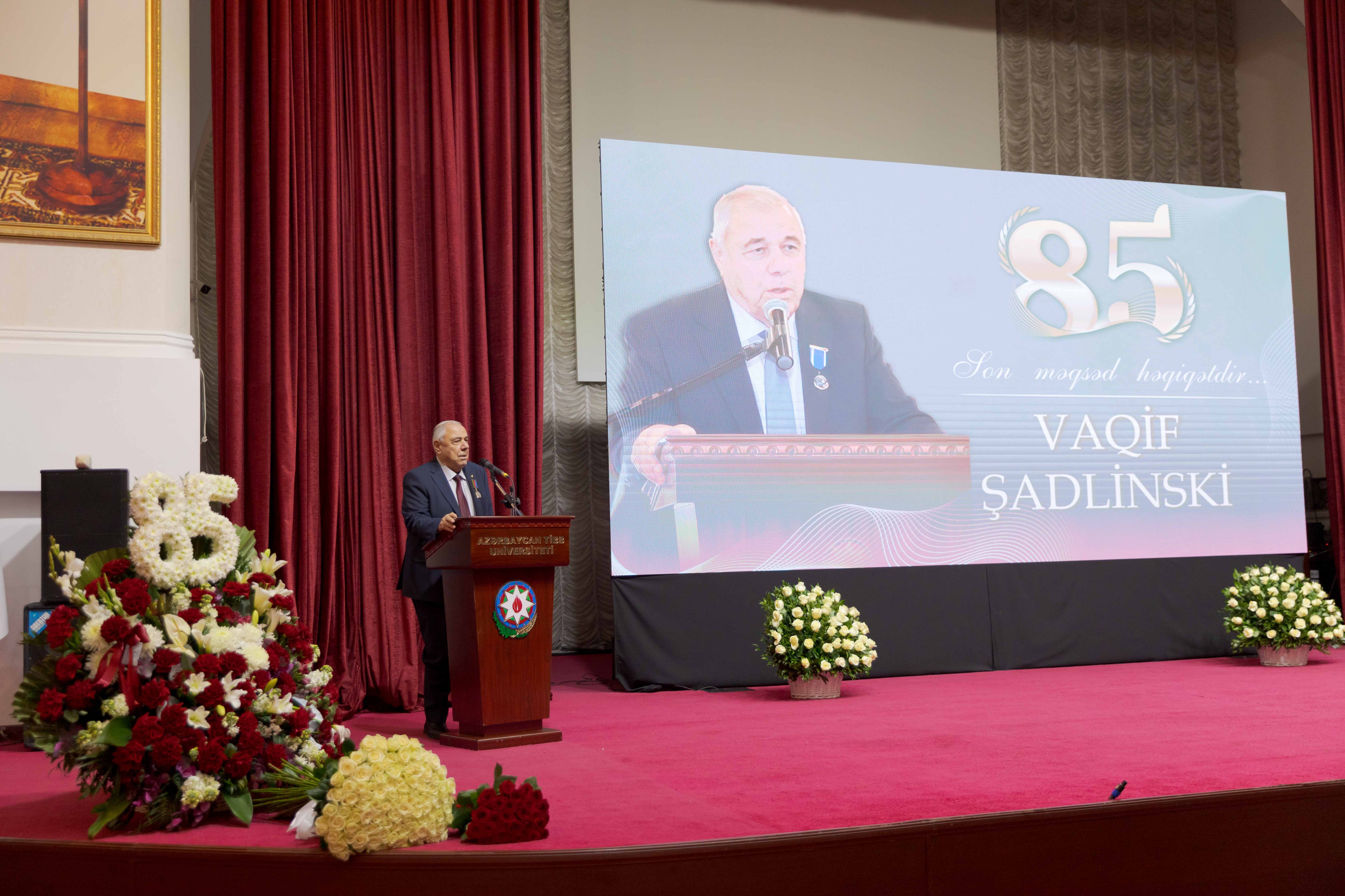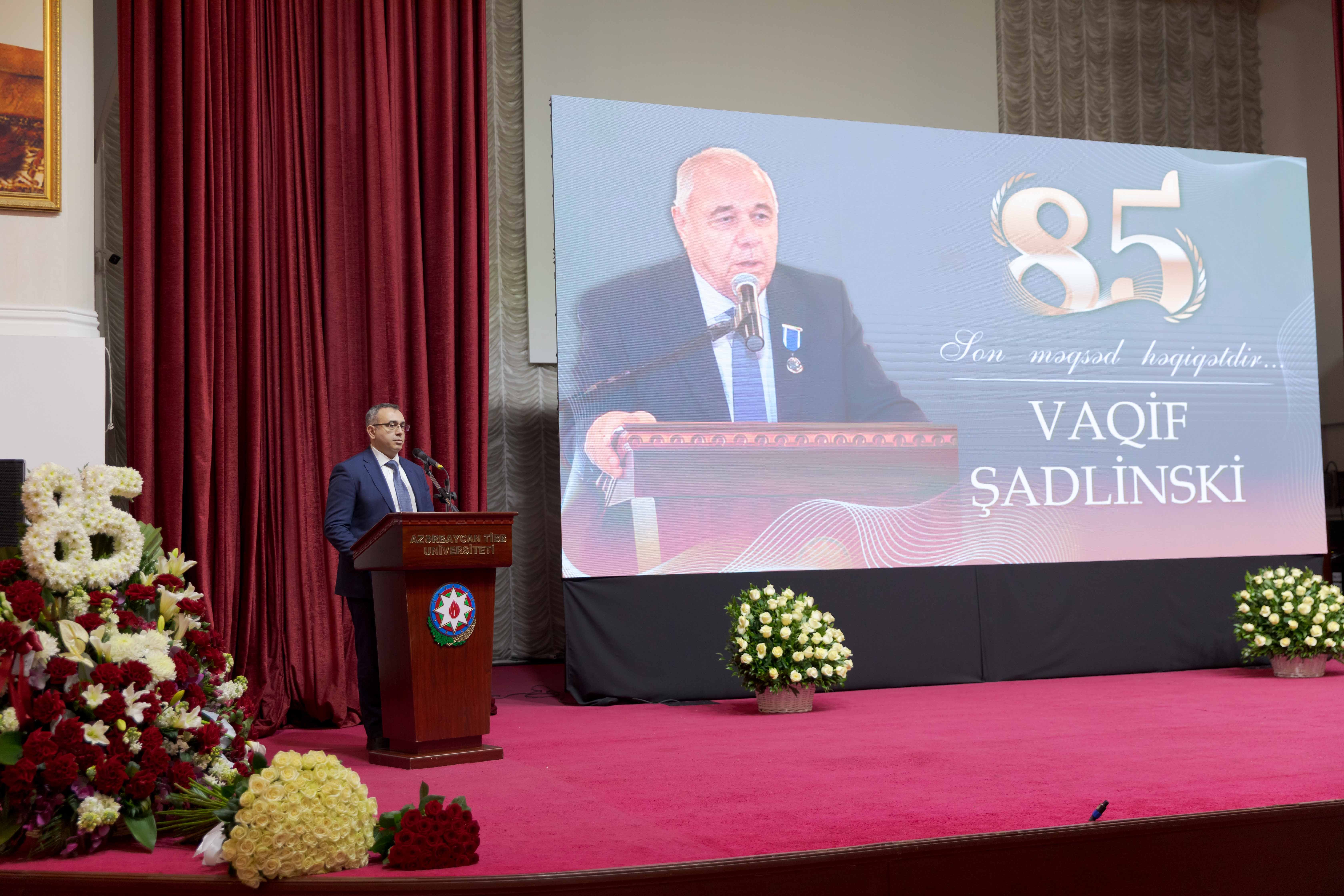 Tədbir iştirakçılarını salamlayan ATU-nun rektoru, professor Gəray Gəraybəyli  qeyd edib ki, tanınmış ziyalıların, elm, mədəniyyət, ədəbiyyat xadimlərinin, səhiyyə və təhsil işçilərinin yubileylərinin keçirilməsi ölkəmizdə bir ənənə halını alıb. Əsası xalqımızın Ulu Öndəri Heydər Əliyev tərəfindən qoyulan bu ənənəni möhtərəm prezidentimiz İlham Əliyevin uğurla davam etdirdiyini, xüsusi fəaliyyətləri ilə seçilən şəxslərə həmişə yüksək qiymət verildiyini bildirib: “Bu gün universitetimizdə çox möhtəşəm bir gündür. Bildiyiniz kimi, bu il universitetimizin 95 illiyi qeyd olunur. Bu uzun illəri zənginləşdirən, tarixə çevirən isə görkəmli korifeylərimizdir. Onlardan biri də professor Vaqif Şadlinskidir. Mən taleyimdən çox razıyam ki, həyatımda həmişə yaxşı müəllimlərim olub və belə müəllimlərdən biri, bəlkə də birincisi elə Vaqif müəllimdir. Mənim Vaqif müəllimlə ilk tanışlığım 1984-cü il sentyabrın 1-də olub. O zaman universitetin 1-ci kurs tələbəsi olaraq Anatomiyadan ilk dərsdə iştirak etdik. İki semestr boyunca Vaqif müəllim bizə bu fənni tədris edib və tibb elmini sevdirən şəxs olub. Vaqif müəllim mənim ürəyimdə böyük müəllim və böyük ağsaqqaldır”.