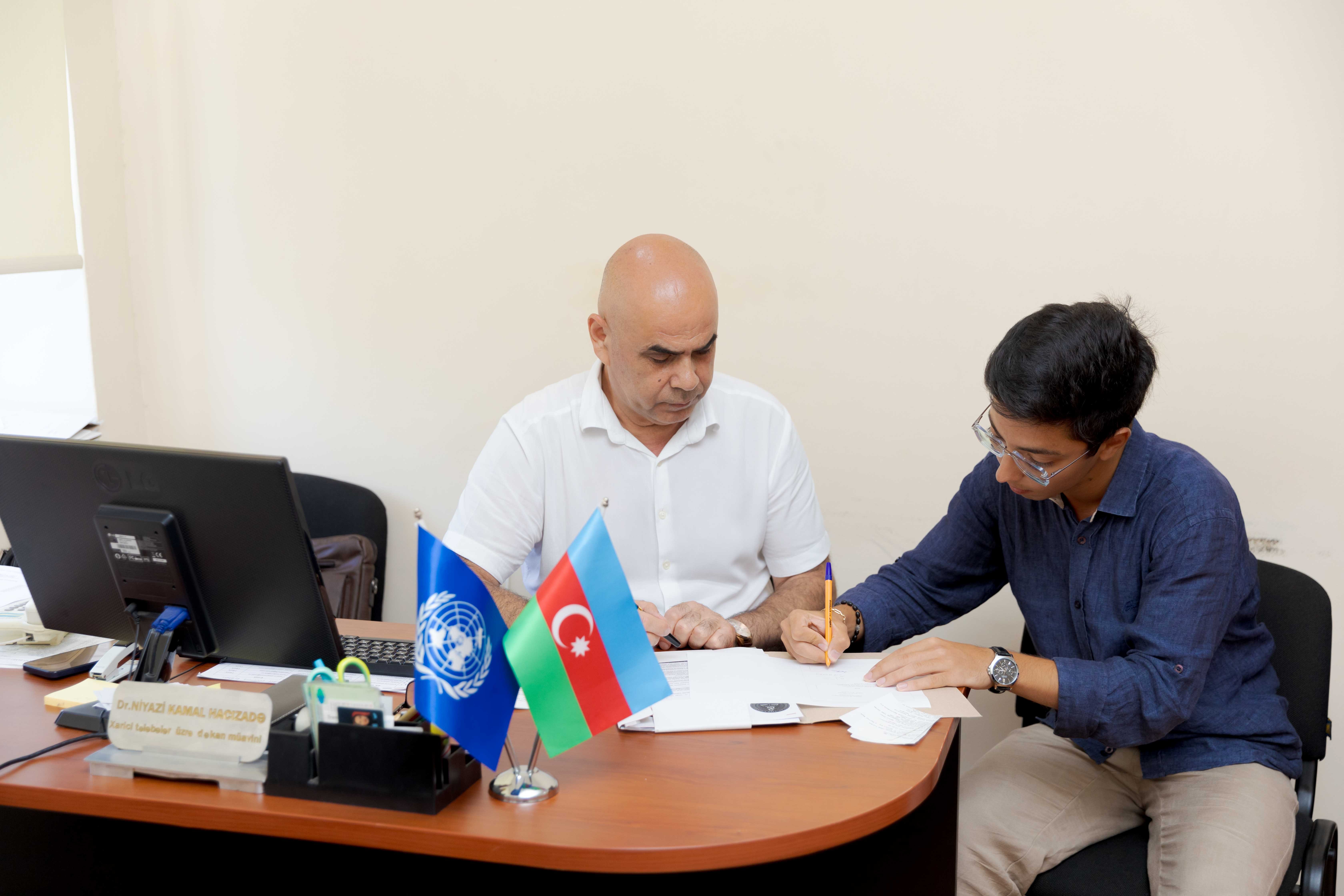 Dekan N. Bayramov həmçinin müsabiqədən uğurla keçərək qəbul statusu almış tələbələrin məlumatları portal sistemində qeyd olunduğunu da vurğuladı: “Qəbul statusu almış tələbələrin məlumatları portal sistemində qeyd olunur və həmin tələbələr universitetə gələrək tələb olunan sənədləri Əcnəbi Tələbələrlə İş üzrə Dekanlığa təqdim edirlər. Sənədlər təsdiqləndikdən sonra tələbələr rəsmi şəkildə universitetin tələbəsi hesab olunur və müvafiq qruplara yerləşdirilirlər”.
